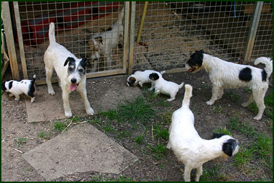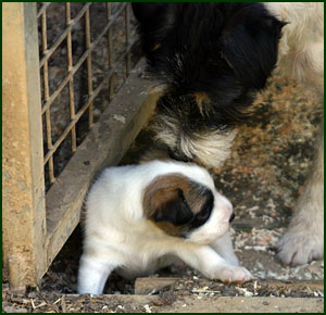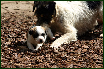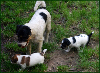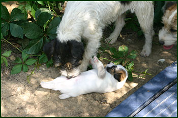 ![]() Die Welpen sind jetzt 4 Wochen alt und dürfen schon in den Garten. Zwar noch etwas tapsig aber voller Entdeckungssinn wird der Garten und die viele Verwandtschaft neugierig erkundet. Auch die älteren Hunde freuen sich auf die kleinen Welpen. Man muß zwar noch aufpassen, dass sie nicht zu grob spielen, aber so beginnt eben die Sozialisierung ... | |