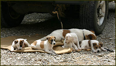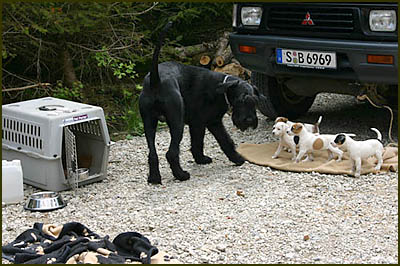 geschossen worden war, war höchst interessant. In Isa's und Klaus' Jagdhütte haben wir dann Kaffee getrunken während die Hunde sich ausruhten. Ein Riesenschnauzer, der noch zu Besuch kam, wurde freundlich beäugt. So einen Riesen hatten die Welpen noch nie gesehen! |