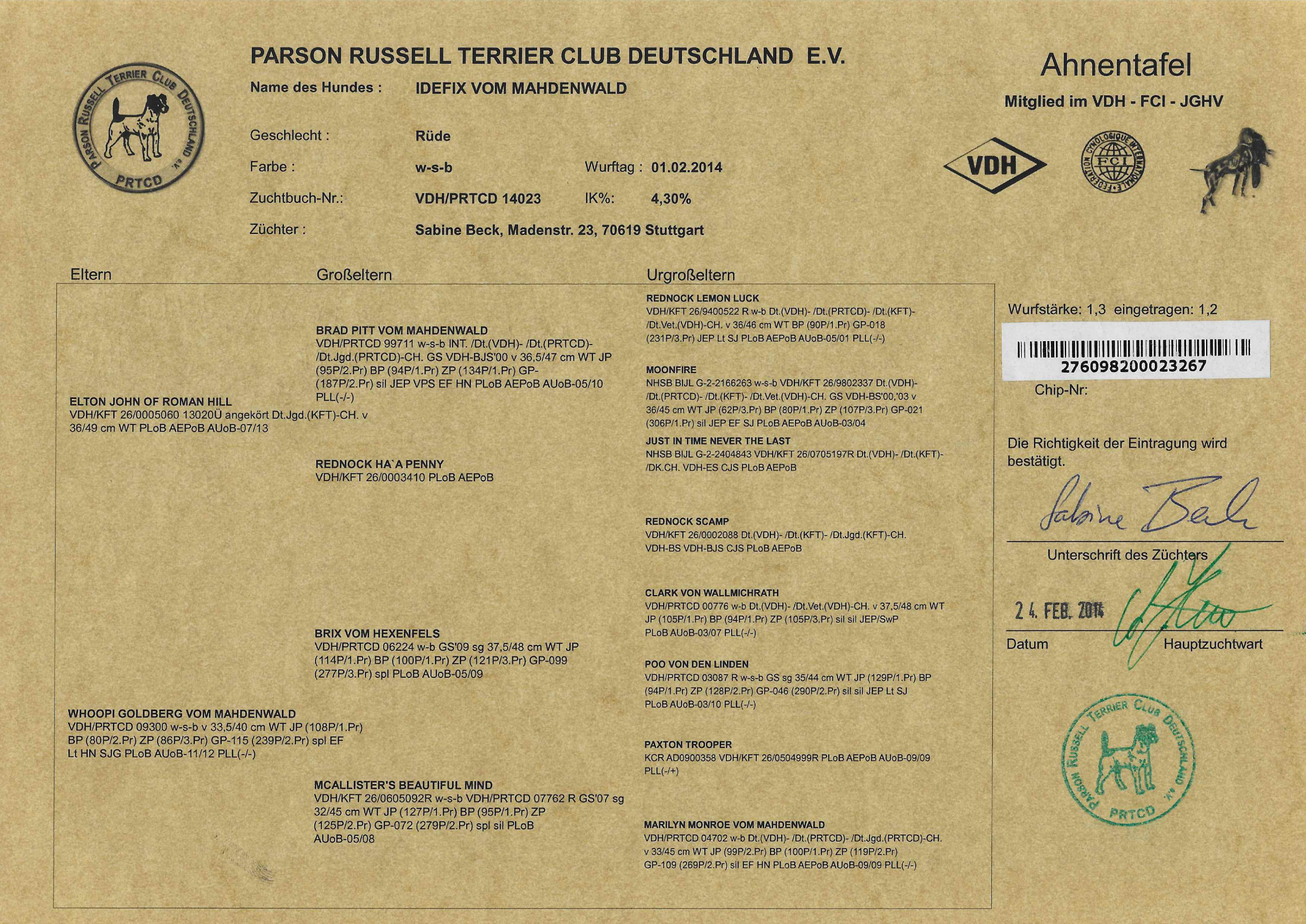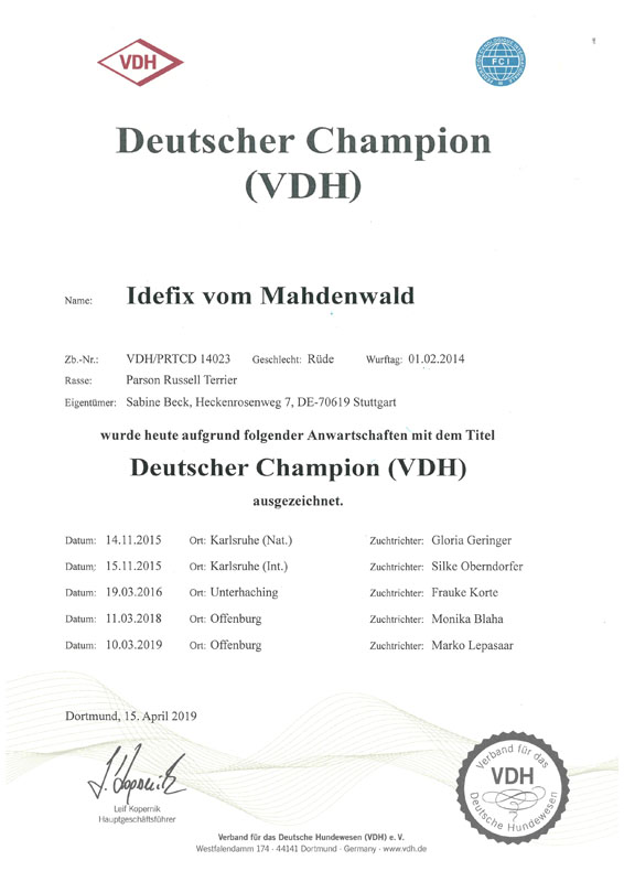 geb. 01.Februar 2014 Deutscher Champion (VDH) Prüfungen: WT, JP, BP, GP, sl, HN V1 ,Res.CACIB Untersuchungen: AuoB, PloB, PLL (-/-), DNA, AepoB LOA n/n SCA n/j DM n/n