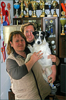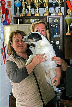 "Da kommt Kalle" abgedreht ist. Seine Trainerin Renate Hiltl (auf dem Bild links, rechts ihre Freundin Uschi)war sehr traurig, daß sie sich nun wieder von Boomer trennen mußte. Durch die gemeinsame Arbeit am Set sind sie als Team eng zusammen gewachsen. Boomer freute sich sehr, als er seine Verwandschaft sowie meinen Sohn Tobias und mich wiedersah. Als wäre er nie fort gewesen, wurde er ohne Probleme wieder von den restlichen Hunden ins Rudel aufgenommen. |