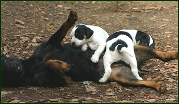 Die Ypsilon-Babies sind nun fast 5 Wochen alt und machen nun den Garten unsicher. Ganz erfreulich finden sie es, dass noch einige andere Hundeexemplare im Garten herumlaufen, die immer mal wieder gerne mit ihnen spielen ...;